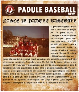 La Polisportiva Padulebaseball nasce nel giugno del 1979 grazie all’idea e all’impegno di Romano Becchi,mentre la prima iscrizione della società al CONI risale al 1980. Nei primi 3 anni di attività la società iscrive ai campionati soltanto squadre giovanili (ragazzi,pre-allievi e allievi) espandendosi poi grazie alla crescita dei suoi atleti,crescita che permette alla società di partecipare nel 1983 al suo primo campionato nazionale di serie C/2. Nel 1986 la squadra ottiene la promozione in C/1,lasciando la serie C/2 dove la prima squadra rossoblu non è più tornata. Dopo 4 anni termina anche la permanenza in C/1 grazie alla promozione in serie B ottenuta nel 1990. Nel 1994 arriva la prima storica promozione in A/2,categoria in cui la squadra rimane per due stagioni consecutive,prima di tornare in serie B nel 1996. Negli anni successivi, il Padule si consolida come una delle più importanti realtà del baseball toscano, raggiungendo più voltela Final Fourdi Coppa Italia e ritrovando la serie A/2 nella stagione 2005. La crescita del Padule ha raggiunto uno dei suoi punti più alti proprio nel 2012, grazie alla promozione in serie A federale raggiunta dopo aver dominato per intero la stagione di serie B. La società non vive però della sola attività della prima squadra. Importante è anche l’impegno nel settore giovanile,con numerosi successi raggiunti soprattutto nelle categorie Ragazzi e Juniores. Tra questi spiccano le 4 finali nazionali consecutive raggiunte tra il 1983 e il 1986. Nelle ultime stagioni, grandi soddisfazioni sono arrivate in particolare dalla squadra Allievi, che ha raggiunto il terzo posto nel torneo della Winterleague di Bologna e ha vintola CoppaToscanasempre nel 2012. Il vivaio sestese si è poi arricchito nelle ultime due stagioni di una nuova formazione di Serie C, nata per aiutare la crescita dei tanti ragazzi che, usciti dalle categorie giovanili, sperano di trovare in futuro uno spazio in prima squadra.